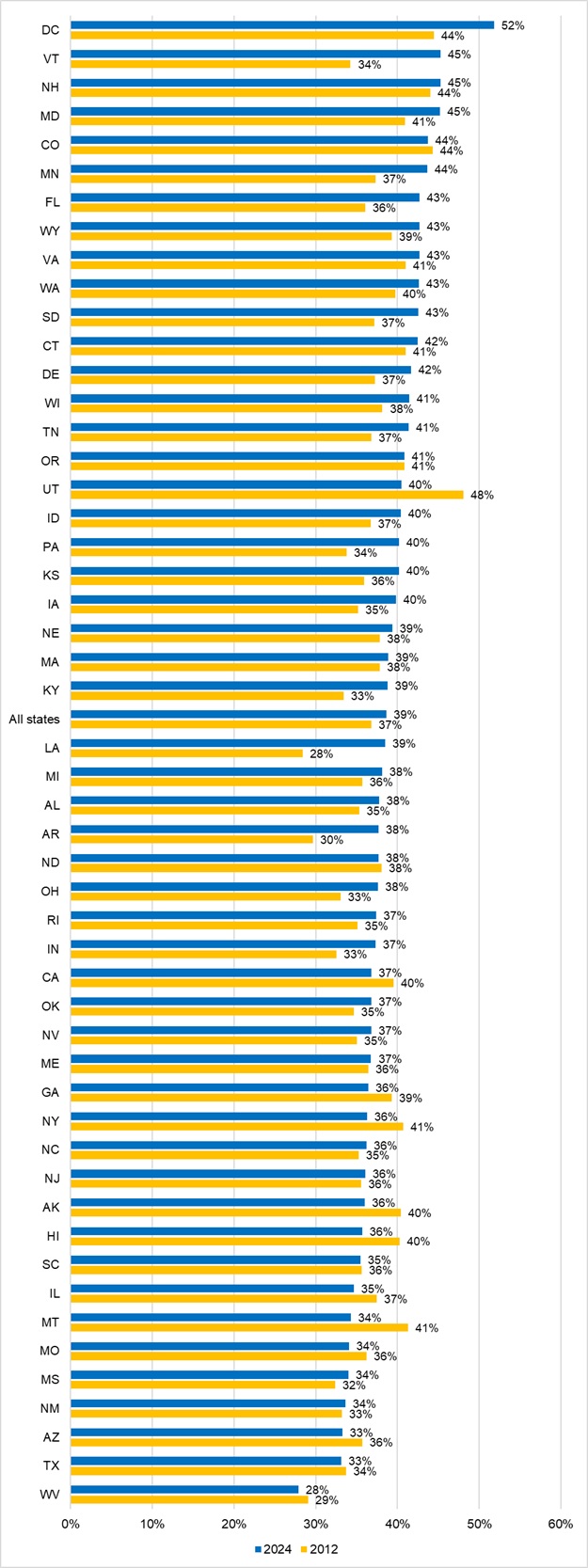 From 2012 to 2024, 32 states and D.C. experienced increases in the share of adults estimating their retirement savings needs, while 18 states saw declines or rates remaining unchanged. Notably, 13 reported positive changes of more than 5 percentage points, while three reported a negative change of more than 5 percentage points.